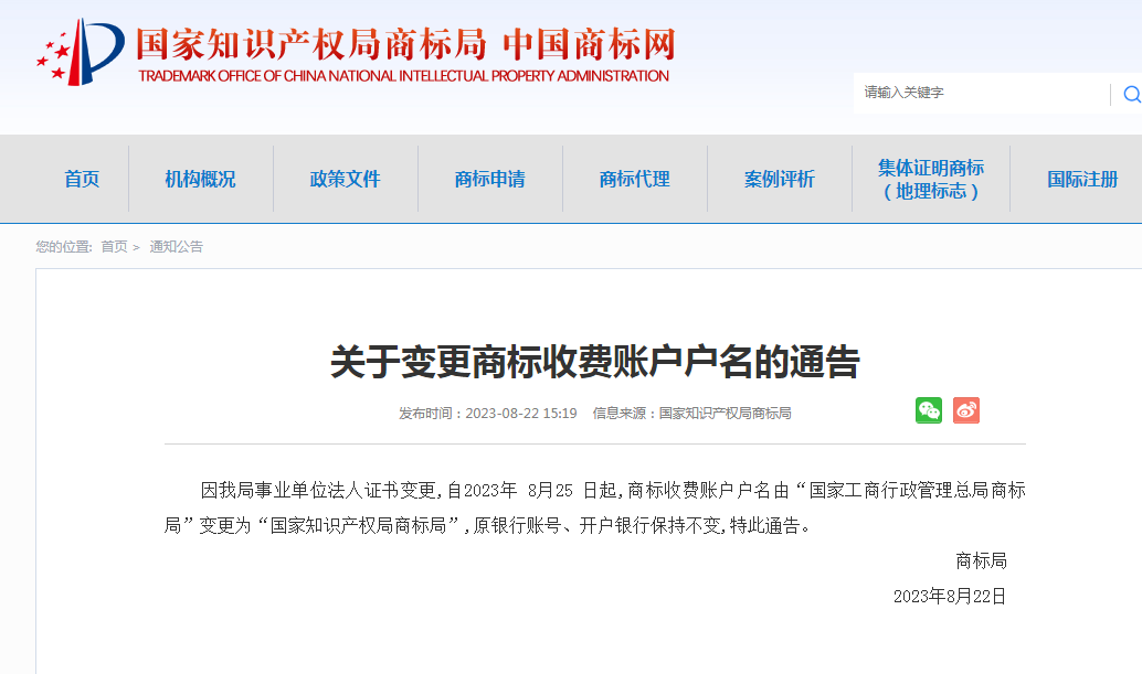 关于变更商标收费账户户名的通告