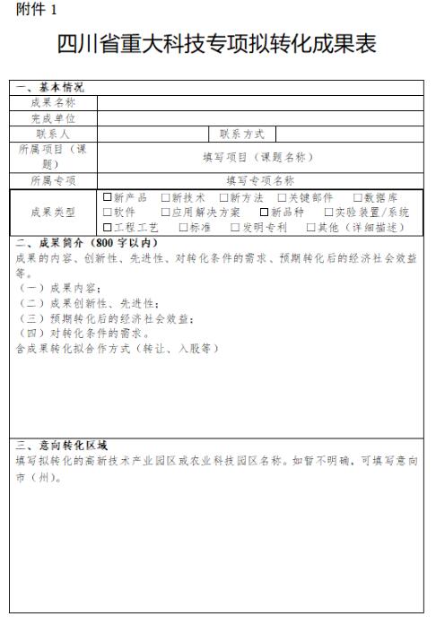 请各项目承担单位高度重视,根据所承担的重大科技专项项目(课题),认真梳理拟转化的科技创新成果,于2023年9月20日之前将拟转化成果表(详见附件1)报送至科技厅重大专项处指定邮箱。