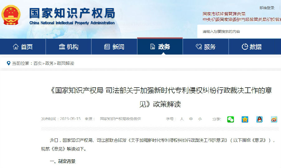 近日,国家知识产权局、司法部联合印发《关于加强新时代专利侵权纠纷行政裁决工作的意见》(以下简称《意见》),现就《意见》解读如下。