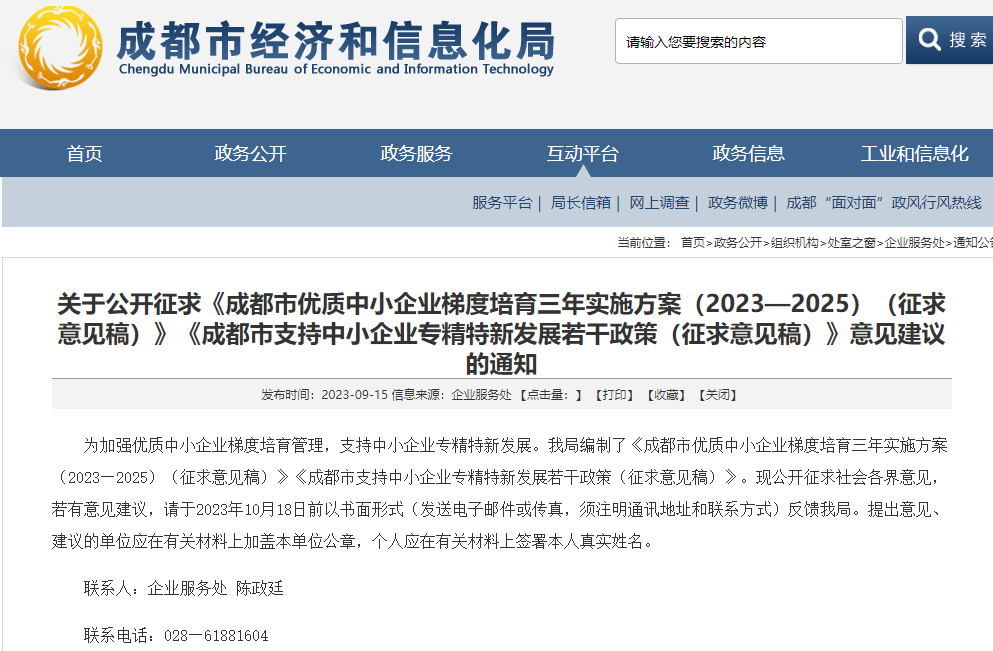 为加强优质中小企业梯度培育管理,支持中小企业专精特新发展。我局编制了《成都市优质中小企业梯度培育三年实施方案(2023—2025)(征求意见稿)》《成都市支持中小企业专精特新发展若干政策(征求意见稿)》。现公开征求社会各界意见,若有意见建议,请于2023年10月18日前以书面形式(发送电子邮件或传真,须注明通讯地址和联系方式)反馈我局。提出意见、建议的单位应在有关材料上加盖本单位公章,个人应在有关材料上签署本人真实姓名。