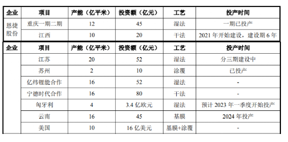 例如,恩捷股份近日在回答投资者提问时表示,截至2022年底公司湿法锂电池隔膜产能规模达70亿平,并有多个项目在建。据不完全统计,恩捷股份在建产能就高达数十亿平米。