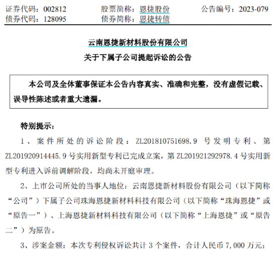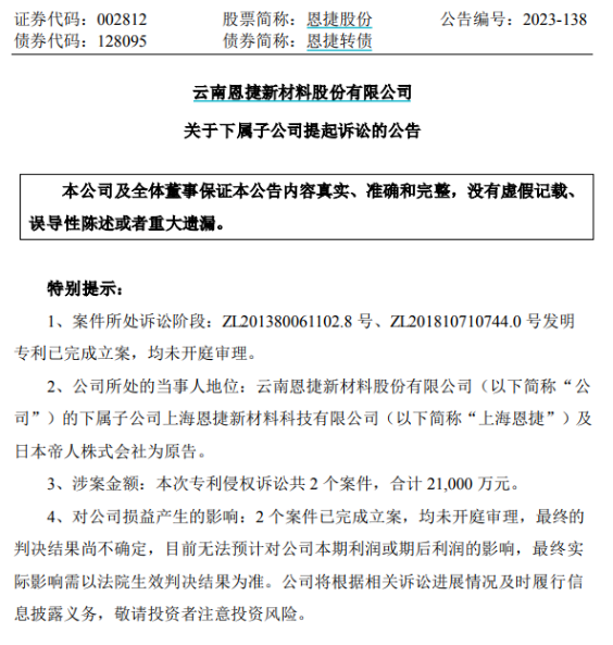 今年5月,恩捷股份发布公告称,子公司珠海恩捷、上海恩捷就金力股份及相关方侵害公司发明专利权、实用新型专利权纠纷,分别向石家庄市中级人民法院、广州知识产权法院提起诉讼。