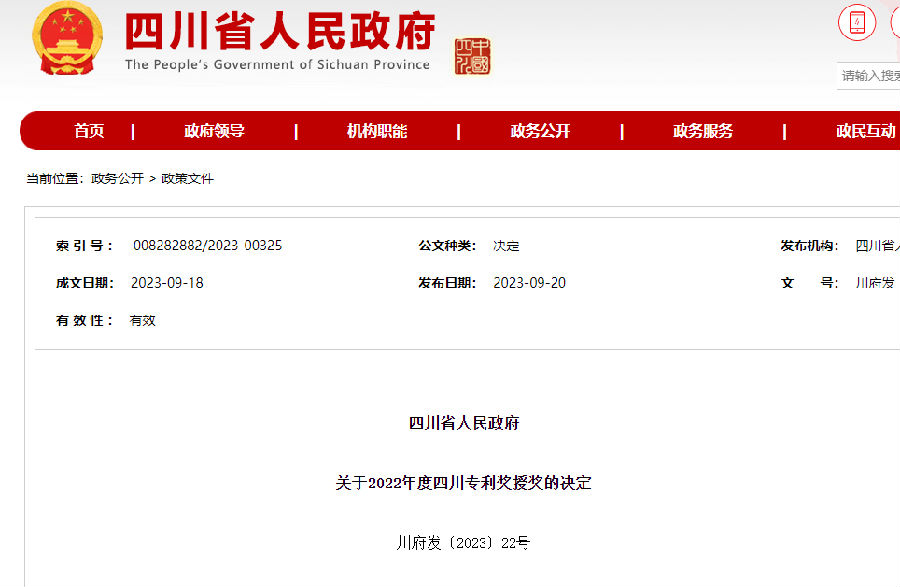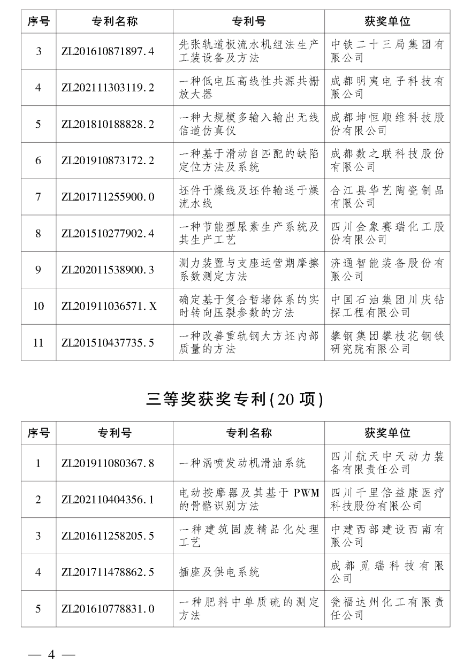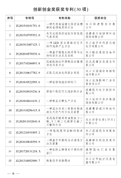 为深入贯彻习近平新时代中国特色社会主义思想,认真落实习近平总书记来川视察重要指示精神和关于知识产权工作系列重要论述,加快建设高水平知识产权强省,根据《四川省专利实施与产业化激励办法》,经四川省专利实施与产业化奖(以下简称四川专利奖)评审委员会评审,省政府决定授予“光学玻璃及光学元件”1项专利四川专利奖特等奖,授予“引导飞机地面滑行的灯光控制方法、装置、系统及介质”等4项专利四川专利奖一等奖,授予“一种吸附破伤疫苗后工艺脱毒控制系统及工艺方法”等11项专利四川专利奖二等奖,授予“一种涡喷发动机滑油系统”等20项专利四川专利奖三等奖,授予“一种利用高温糖化堆面层糟醅制备调味酒的方法”等30项专利四川专利奖创新创业奖。