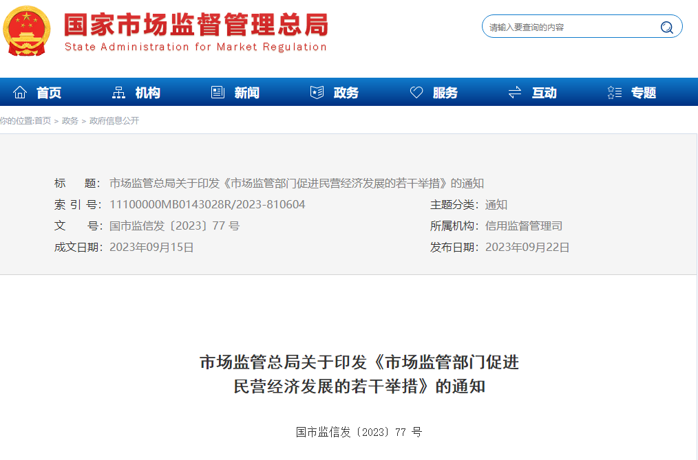 关于印发《市场监管部门促进民营经济发展的若干举措》的通知
