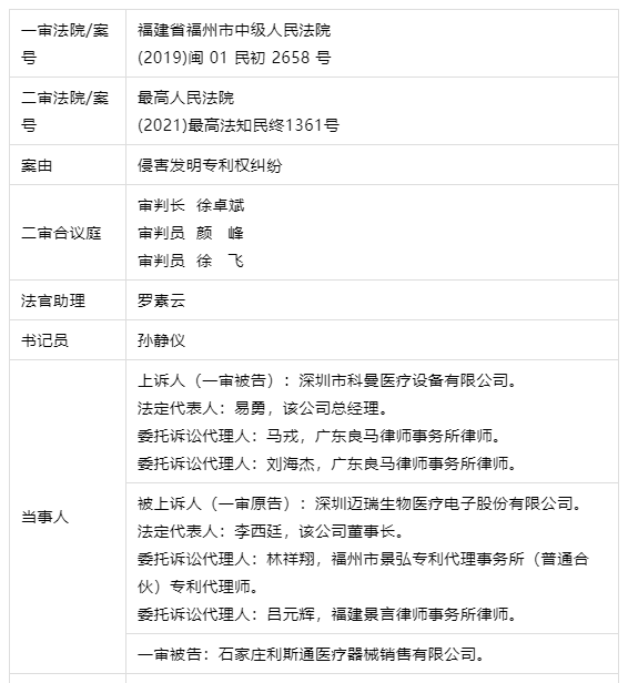 上诉人深圳市科曼医疗设备有限公司(以下简称科曼公司)因与被上诉人深圳迈瑞生物医疗电子股份有限公司(以下简称迈瑞公司)、一审被告石家庄利斯通医疗器械销售有限公司(以下简称利斯通公司)侵害发明专利权纠纷一案,不服福建省福州市中级人民法院于2021年3月23日作出的(2019)闽01民初2658号民事判决,向本院提起上诉。本院于2021年7月13日立案后,依法组成合议庭,并于2021年9月7日询问当事人,上诉人科曼公司的委托诉讼代理人马戎、刘海杰,被上诉人迈瑞公司的委托诉讼代理人林祥翔、吕元辉到庭参加询问,一审被告利斯通公司经本院传票传唤无正当理由未参加询问。本案现已审理终结。
