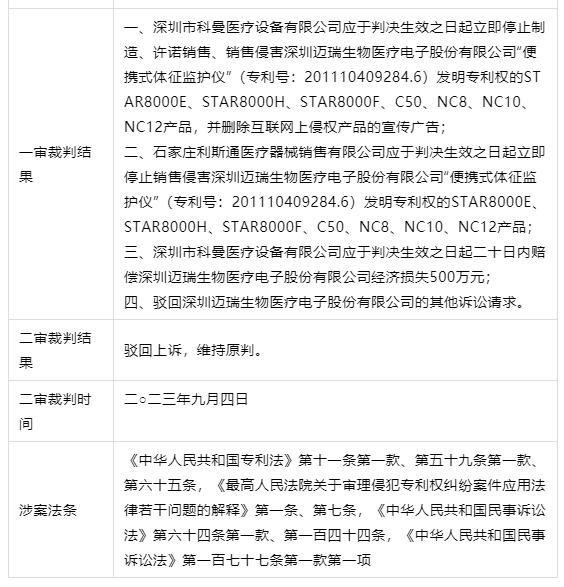 一审法院依照《中华人民共和国专利法》第十一条第一款、第五十九条第一款、第六十五条,《最高人民法院关于审理侵犯专利权纠纷案件应用法律若干问题的解释》第一条、第七条,《中华人民共和国民事诉讼法》第六十四条第一款、第一百四十四条规定,判决:一、深圳市科曼医疗设备有限公司应于判决生效之日起立即停止制造、许诺销售、销售侵害深圳迈瑞生物医疗电子股份有限公司“便携式体征监护仪”(专利号:201110409284.6)发明专利权的STAR8000E、STAR8000H、STAR8000F、C50、NC8、NC10、NC12产品,并删除互联网上侵权产品的宣传广告;二、石家庄利斯通医疗器械销售有限公司应于判决生效之日起立即停止销售侵害深圳迈瑞生物医疗电子股份有限公司“便携式体征监护仪”(专利号:201110409284.6)发明专利权的STAR8000E、STAR8000H、STAR8000F、C50、NC8、NC10、NC12产品;三、深圳市科曼医疗设备有限公司应于判决生效之日起二十日内赔偿深圳迈瑞生物医疗电子股份有限公司经济损失500万元;四、驳回深圳迈瑞生物医疗电子股份有限公司的其他诉讼请求。如果未按判决指定的期间履行给付金钱义务,应当依照《中华人民共和国民事诉讼法》(2017年修正)第二百五十三条之规定,加倍支付迟延履行期间的债务利息。一审案件受理费46800元,由深圳市科曼医疗设备有限公司负担。