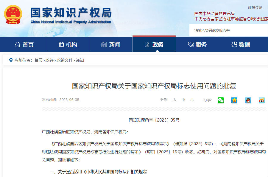 《广西壮族自治区知识产权局关于国家知识产权局标志使用的请示》(桂知报〔2022〕8号)、《海南省知识产权局关于对违法使用国家知识产权局标志等行为进行处理的请示》(琼知〔2023〕18号)收悉。经研究,对国家知识产权局标志使用有关问题,现批复如下: