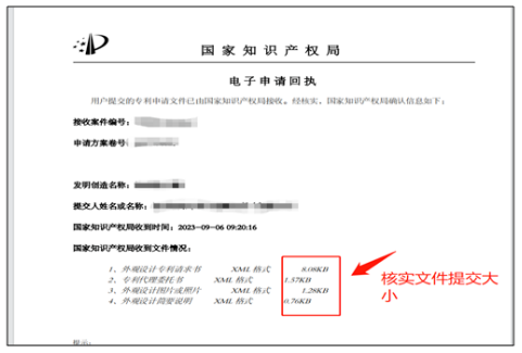 二是及时接收电子申请回执,核对提交文件内容及大小,如与本地编辑文件大小差异较大,则可能存在文件损坏情况。可以如下图方式在电子申请回执中核对提交文件大小。