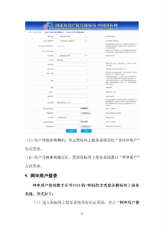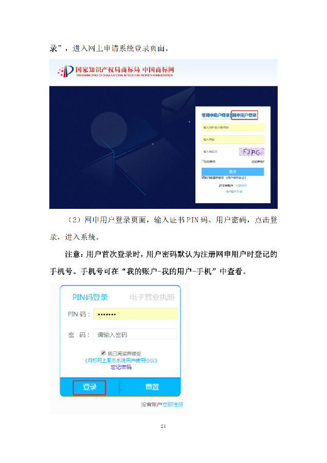 现有商标网上申请系统用户不需再另行注册账号,点击“网申用户登录”跳转至商标网上申请系统首页,使用数字证书+PIN码+密码的方式登录。我局已为网申用户设置了初始密码,初始密码为用户注册手机号,请广大用户提前在“我的账户-我的用户-手机”中查看。