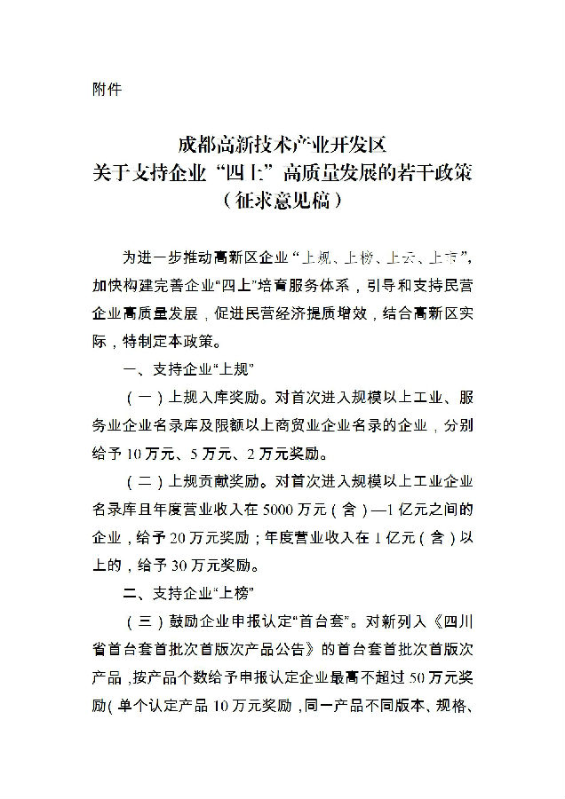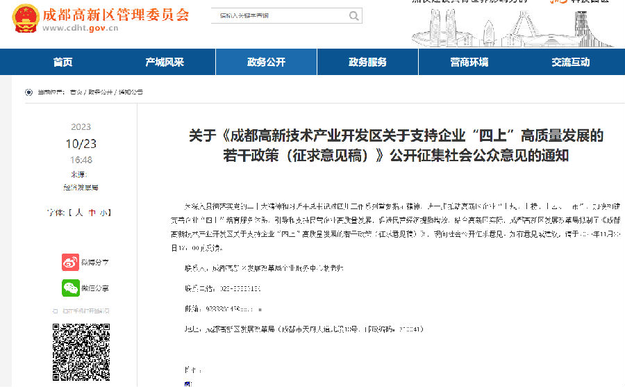为深入贯彻落实党的二十大精神和习近平总书记对四川工作系列重要指示精神,进一步推动高新区企业“上规、上榜、上云、上市”,加快构建完善企业“四上”培育服务体系,引导和支持民营企业高质量发展,促进民营经济提质增效,结合高新区实际,成都高新区发展改革局拟制了《成都高新技术产业开发区关于支持企业“四上”高质量发展的若干政策(征求意见稿)》,现向社会公开征求意见。如有意见或建议,请于2023年11月23日17:00前反馈。