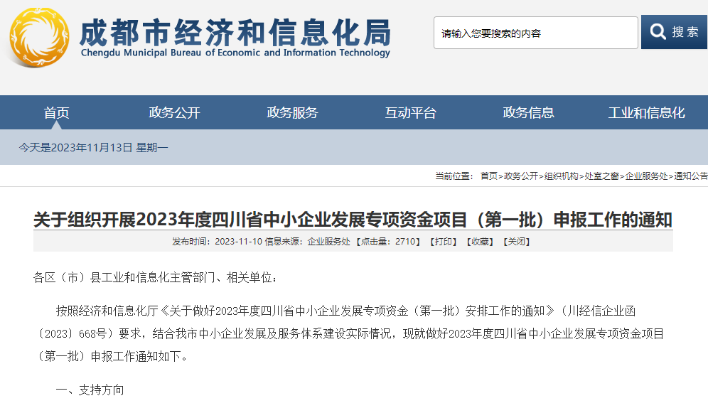 按照经济和信息化厅《关于做好2023年度四川省中小企业发展专项资金(第一批)安排工作的通知》(川经信企业函〔2023〕668号)要求,结合我市中小企业发展及服务体系建设实际情况,现就做好2023年度四川省中小企业发展专项资金项目(第一批)申报工作通知如下。