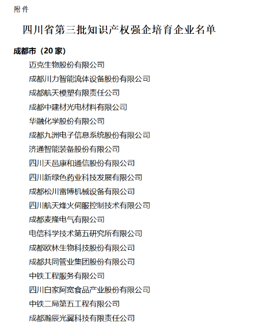 按照《四川省知识产权服务促进中心关于组织开展四川省知识产权强企培育企业申报工作的通知》(川知促办〔2023〕72号)要求,经有关企业自愿申报、相关市(州)市场监督管理局(知识产权局)推荐、专家评审,拟确定迈克生物股份有限公司等31家企业为第三批四川省知识产权强企培育企业(名单见附件)。现予以公示,公示期为2023年11月17日至21日。