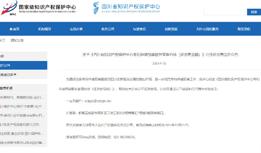为更好发挥专利申请预审服务对四川创新驱动发展的推动作用,进一步规范专利申请预审工作,我中心拟定《四川省知识产权保护中心专利申请预审服务管理办法(征求意见稿)》,现向社会公众公开征求意见。公众可通过以下途径和方式提出反馈意见:
