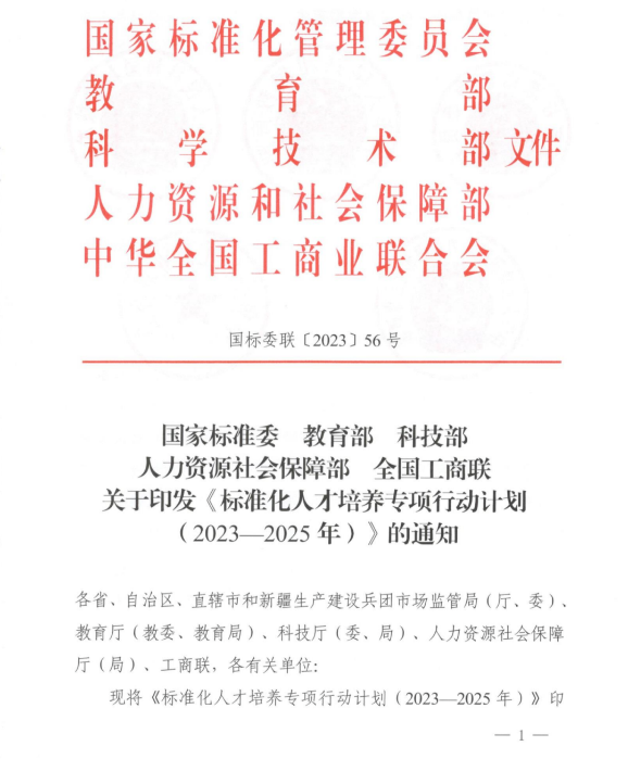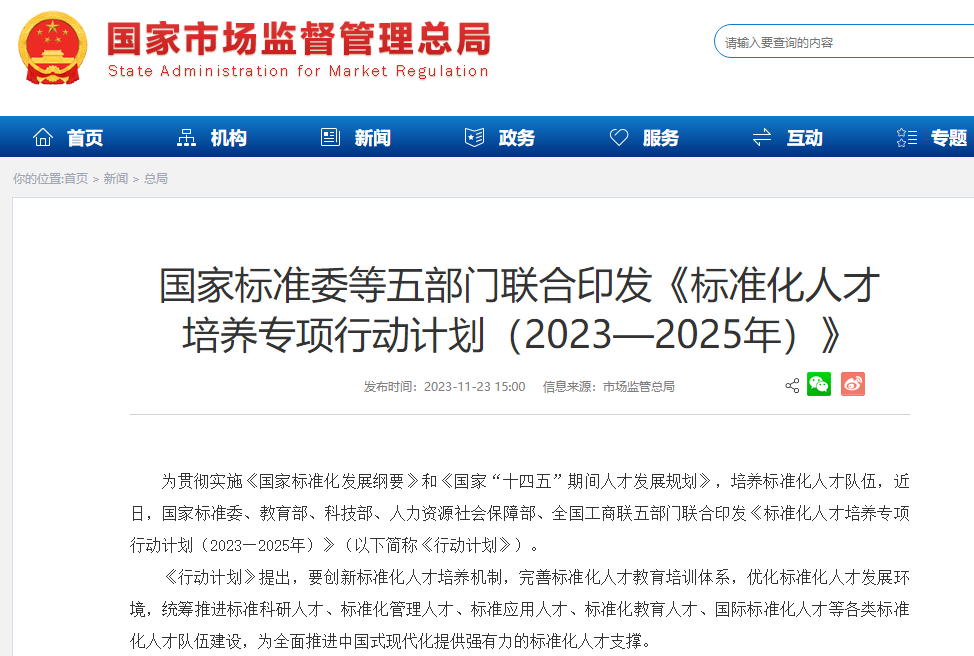 国家标准委等五部门联合印发《标准化人才培养专项行动计划(2023—2025年)》