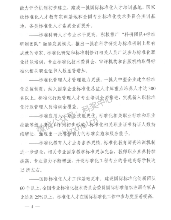 《行动计划》提出,要创新标准化人才培养机制,完善标准化人才教育培训体系,优化标准化人才发展环境,统筹推进标准科研人才、标准化管理人才、标准应用人才、标准化教育人才、国际标准化人才等各类标准化人才队伍建设,为全面推进中国式现代化提供强有力的标准化人才支撑。