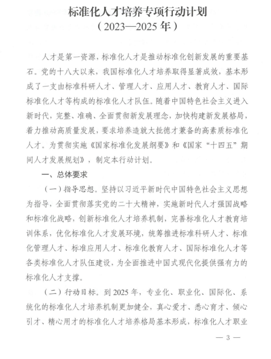 为贯彻实施《国家标准化发展纲要》和《国家“十四五”期间人才发展规划》,培养标准化人才队伍,近日,国家标准委、教育部、科技部、人力资源社会保障部、全国工商联五部门联合印发《标准化人才培养专项行动计划(2023—2025年)》(以下简称《行动计划》)。