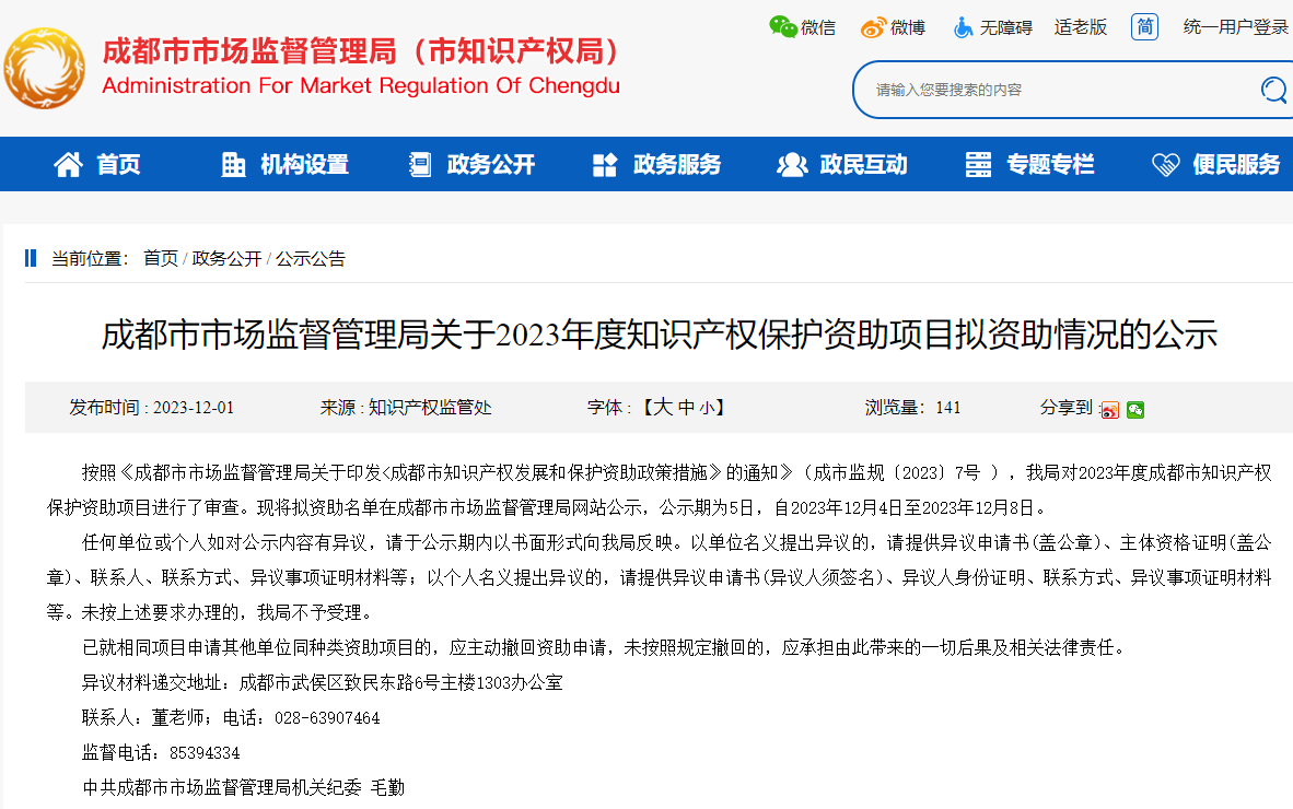 按照《成都市市场监督管理局关于印发<成都市知识产权发展和保护资助政策措施》的通知》(成市监规〔2023〕7号),我局对2023年度成都市知识产权保护资助项目进行了审查。现将拟资助名单在成都市市场监督管理局网站公示,公示期为5日,自2023年12月4日至2023年12月8日。