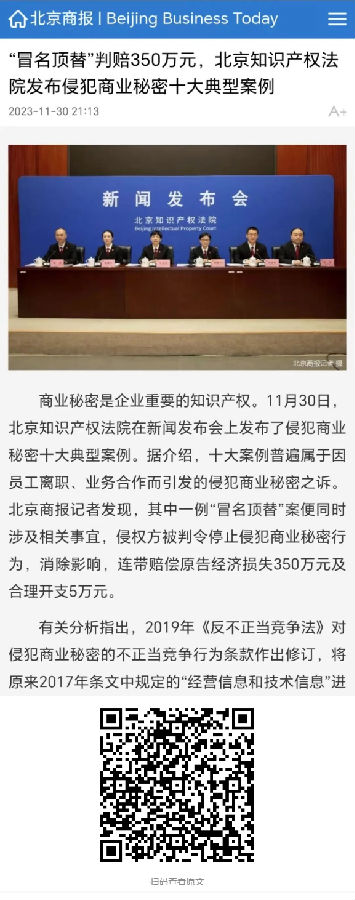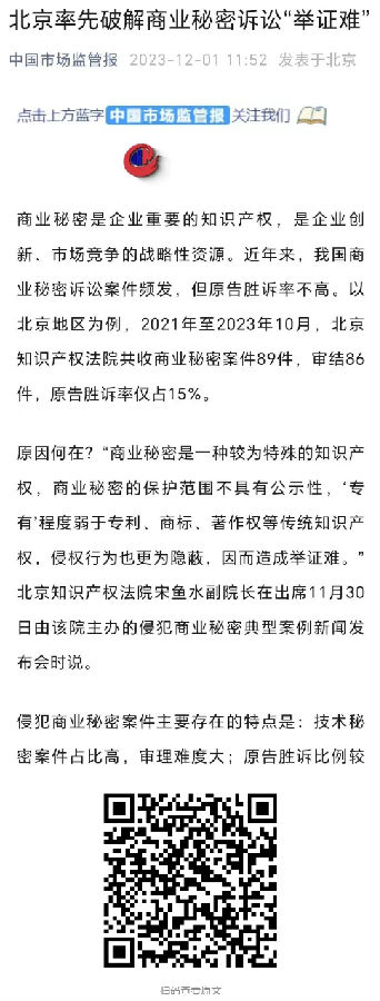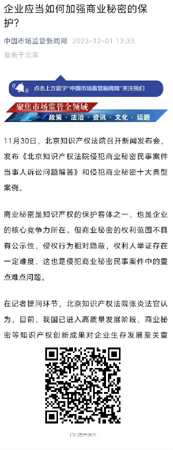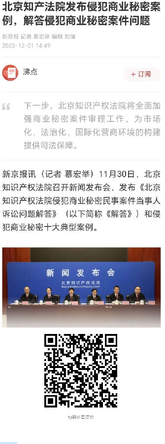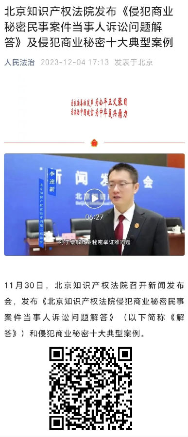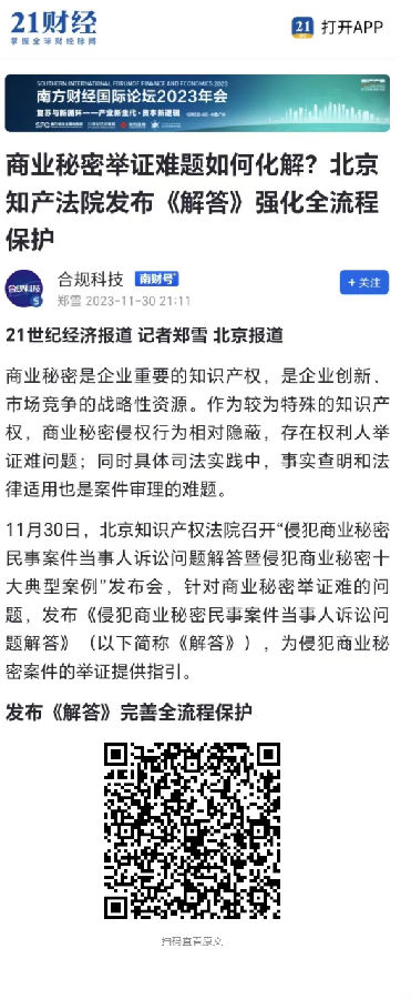 10 《人民法治》杂志: 北京知识产权法院发布《侵犯商业秘密民事案件当事人诉讼问题解答》及侵犯商业秘密十大典型案例 11 21世纪经济报道: 商业秘密举证难题如何化解?北京知产法院发布《解答》强化全流程保护