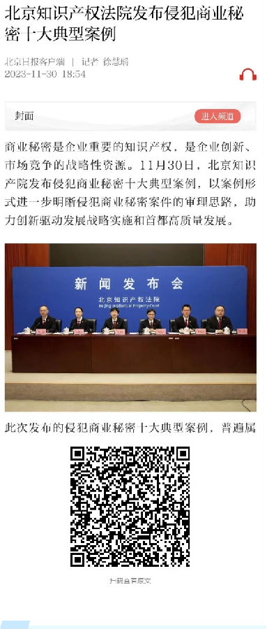 近日,北京知识产权法院召开新闻发布会,发布《北京知识产权法院侵犯商业秘密民事案件当事人诉讼问题解答》和侵犯商业秘密十大典型案例。中国日报、法治日报、中国市场监管报、工人日报、北京广播电视台、北京日报、新京报、北京商报、劳动午报、《人民法治》杂志、21世纪经济报道、中国市场监管新闻网等多家媒体对此进行了报道。