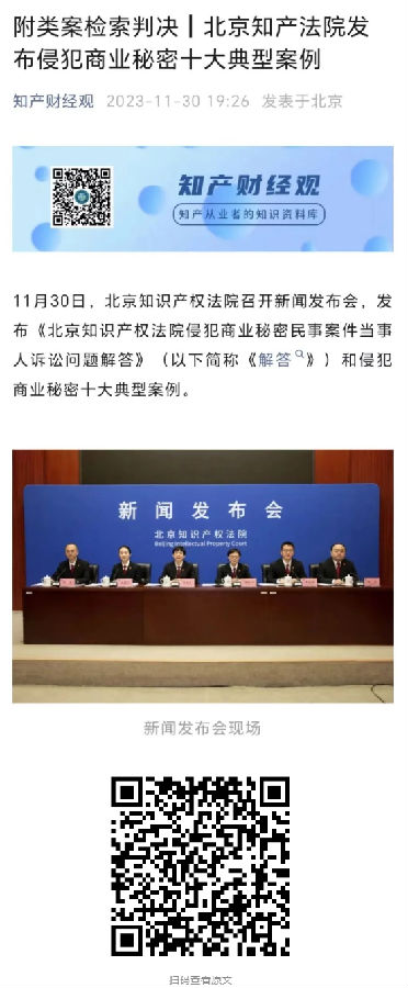 附类案检索判决┃北京知产法院发布侵犯商业秘密十大典型案例