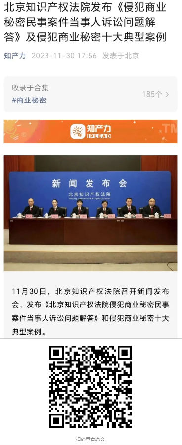 北京知识产权法院发布《侵犯商业秘密民事案件当事人诉讼问题解答》及侵犯商业秘密十大典型案例