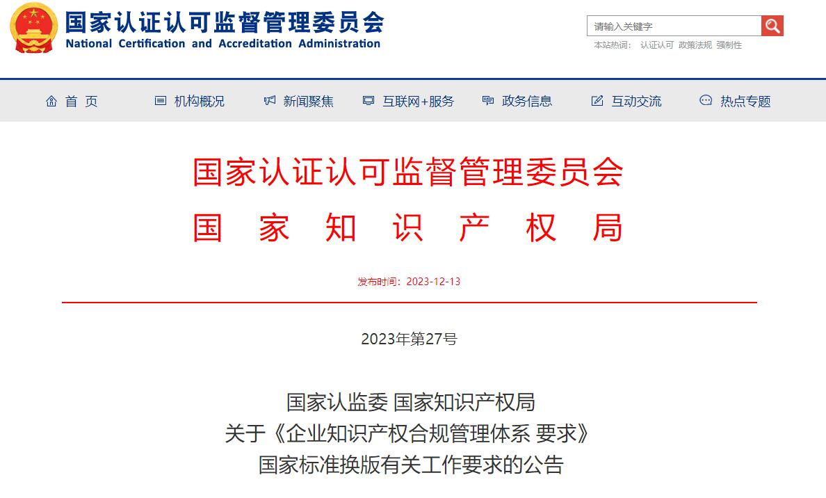 国家标准《企业知识产权合规管理体系 要求》(GB/T 29490-2023,以下称新版标准)已发布,将于2024年1月1日起实施并替代《企业知识产权管理规范》(GB/T 29490-2013,以下称旧版标准)。为保障企业知识产权管理体系认证工作有序实施,现将有关要求公告如下: