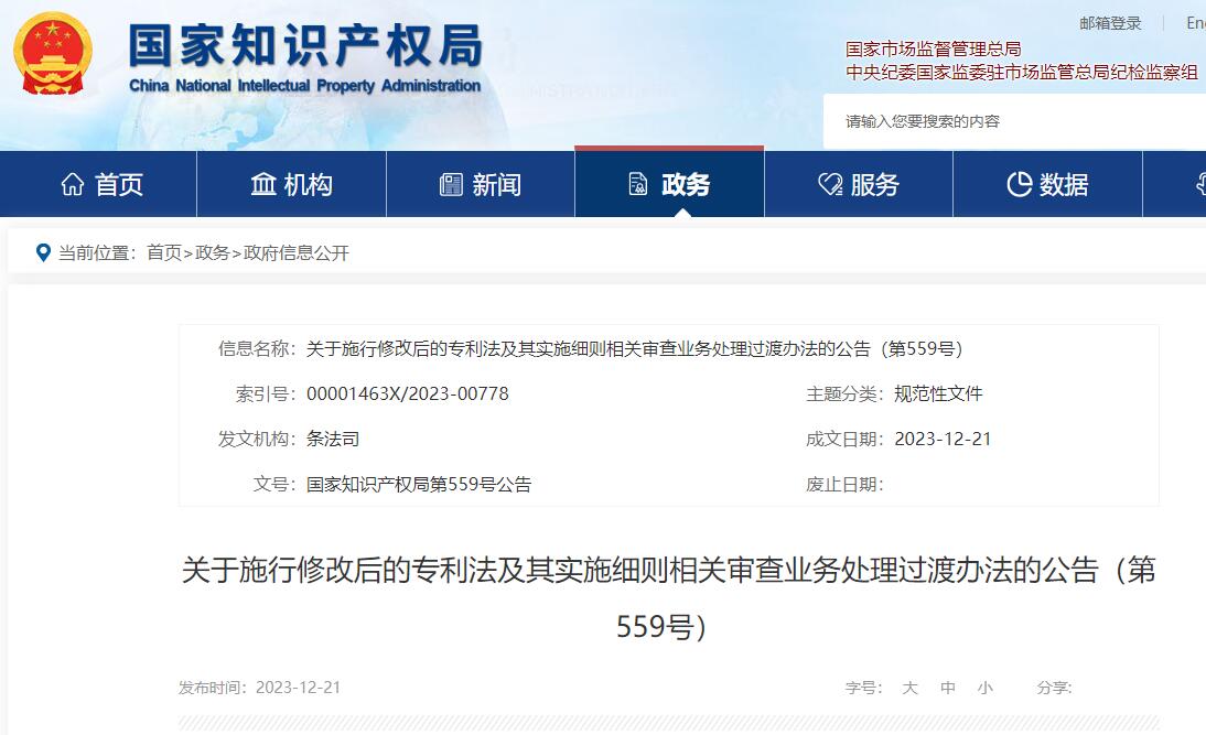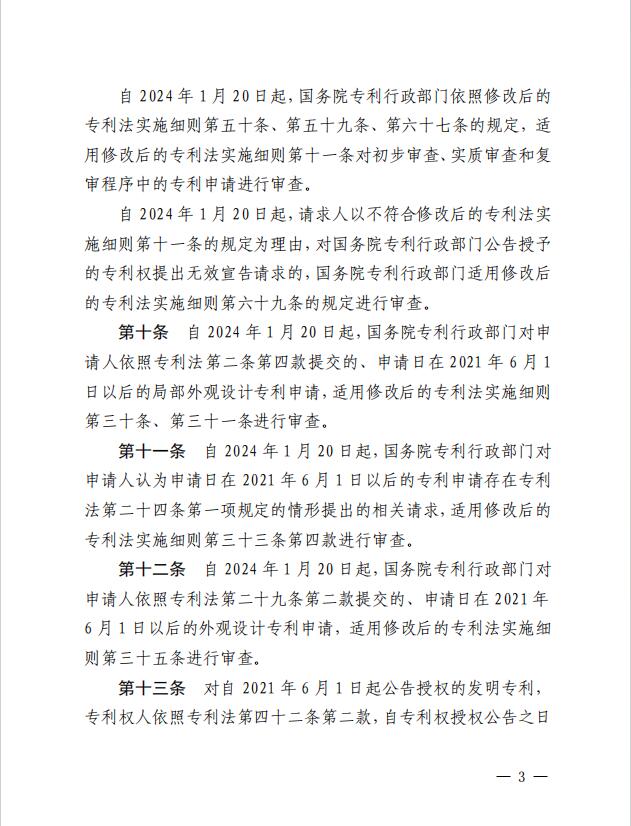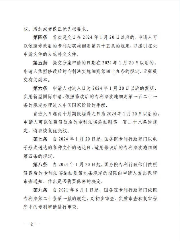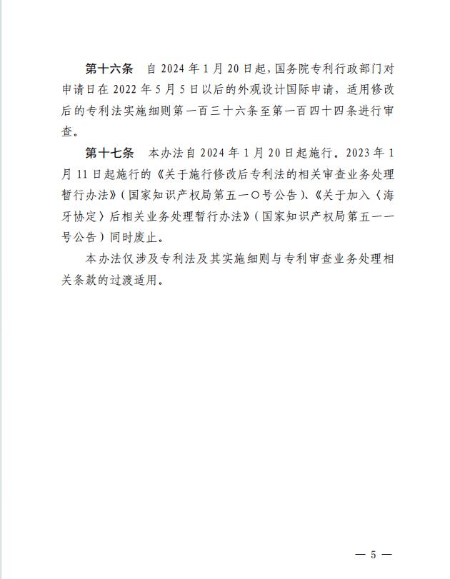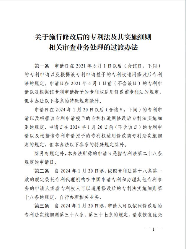 为保障修改后专利法及其实施细则的顺利实施,明确其中涉及审查业务的相关条款在修改后的专利法实施细则生效实施前后的具体适用规则,国家知识产权局制定《关于施行修改后的专利法及其实施细则相关审查业务处理的过渡办法》,现予发布,自2024年1月20日起施行。