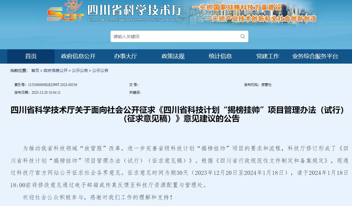 四川省科学技术厅关于面向社会公开征求《四川省科技计划“揭榜挂帅”项目管理办法(试行)(征求意见稿)》意见建议的公告