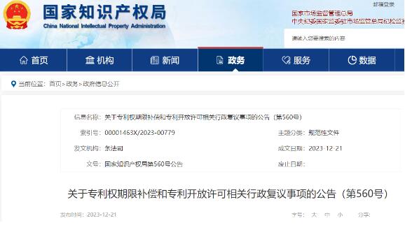 关于专利权期限补偿和专利开放许可相关行政复议事项的公告