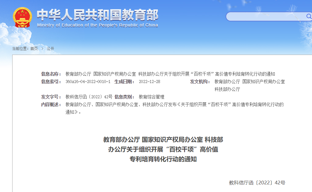 教育部办公厅 国家知识产权局办公室 科技部办公厅关于组织开展“百校千项”高价值专利培育转化行动的通知