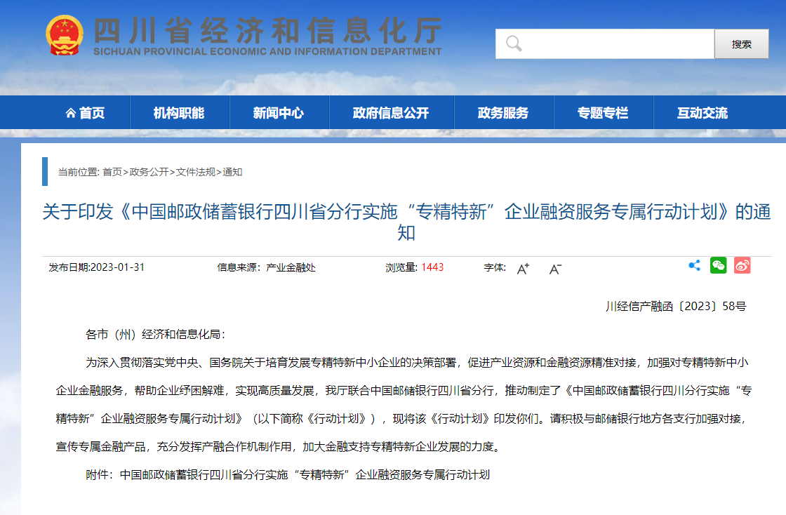 关于印发《中国邮政储蓄银行四川省分行实施“专精特新”企业融资服务专属行动计划》的通知各市(州)经济和信息化局:为深入贯彻落实党中央、国务院关于培育发展专精特新中小企业的决策部署,促进产业资源和金融资源精准对接,加强对专精特新中小企业金融服务,帮助企业纾困解难,实现高质量发展,我厅联合中国邮储银行四川省分行,推动制定了《......