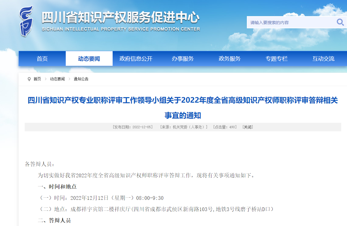 四川省知识产权专业职称评审工作领导小组关于2022年度全省高级知识产权师职称评审答辩相关事宜的通知