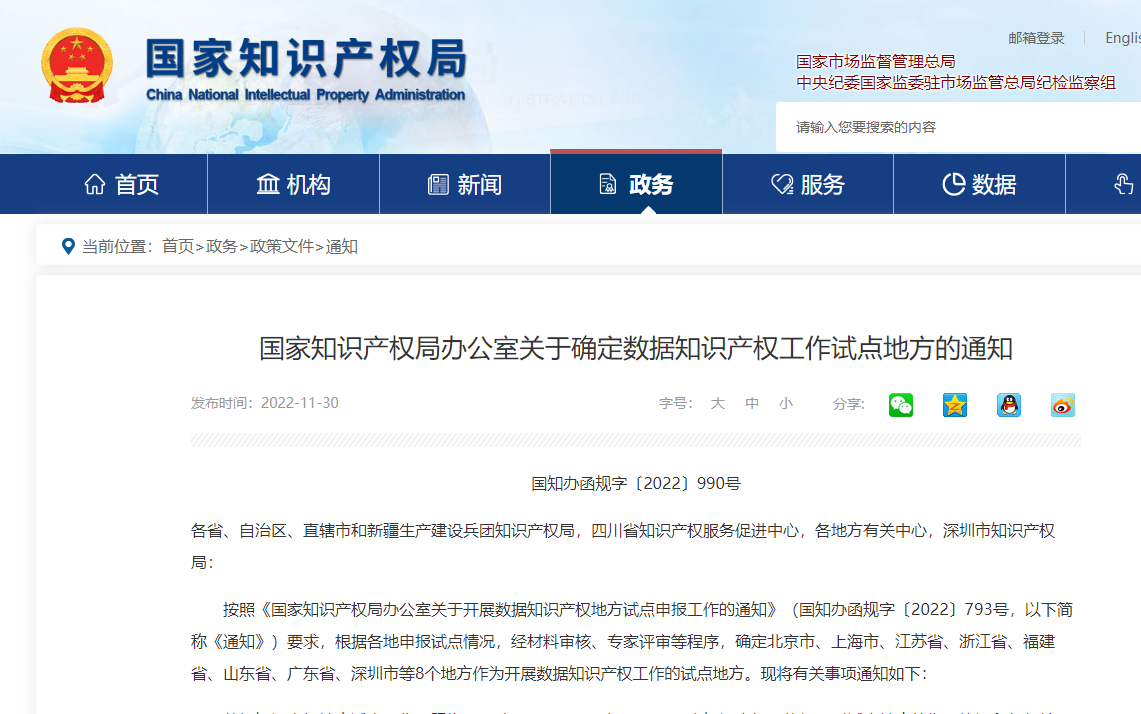 国知局:关于确定数据知识产权工作试点地方的通知