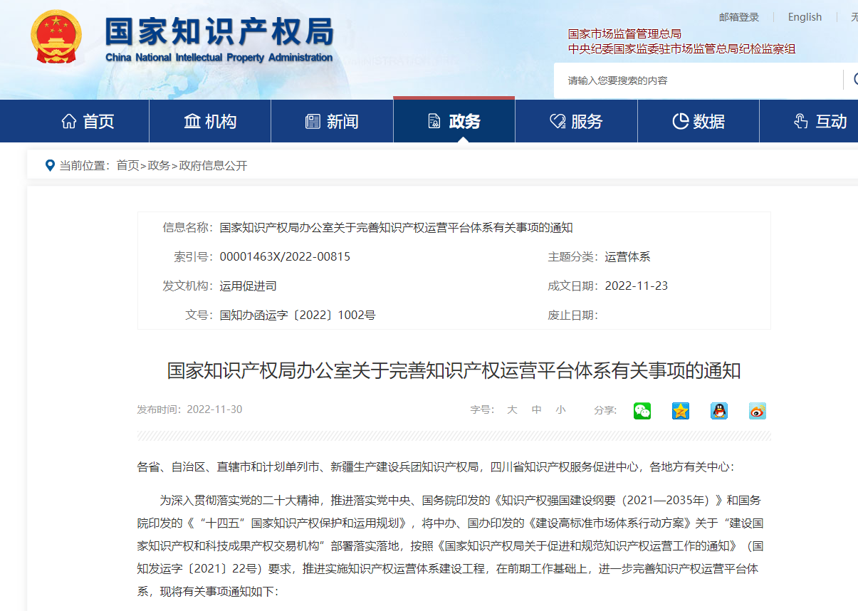国知局:关于完善知识产权运营平台体系有关事项的通知