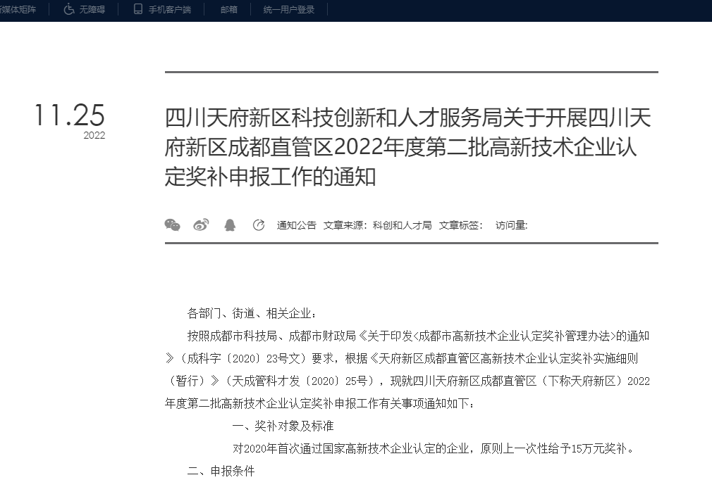 四川天府新区科技创新和人才服务局关于开展四川天府新区成都直管区2022年度第二批高新技术企业认定奖补申报工作的通知