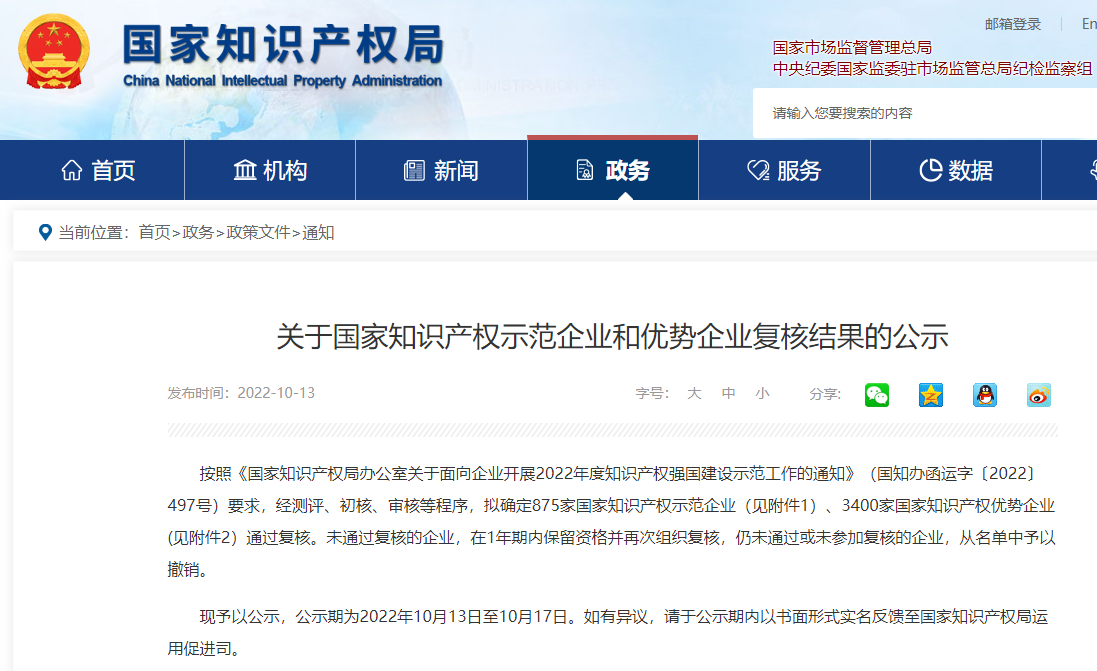 关于国家知识产权示范企业和优势企业复核结果的公示