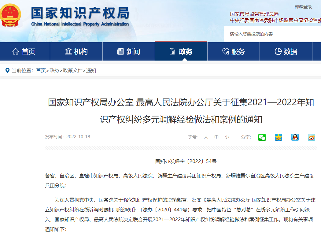国家知识产权局办公室 最高人民法院办公厅关于征集2021—2022年知识产权纠纷多元调解经验做法和案例的通知
