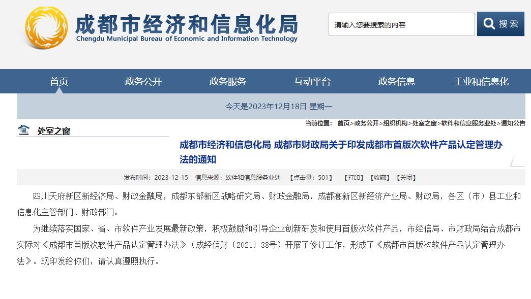 成都市经济和信息化局 成都市财政局关于印发成都市首版次软件产品认定管理办法的通知