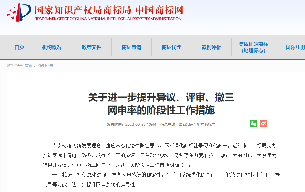 商标局:关于进一步提升异议、评审、撤三网申率的阶段性工作措施