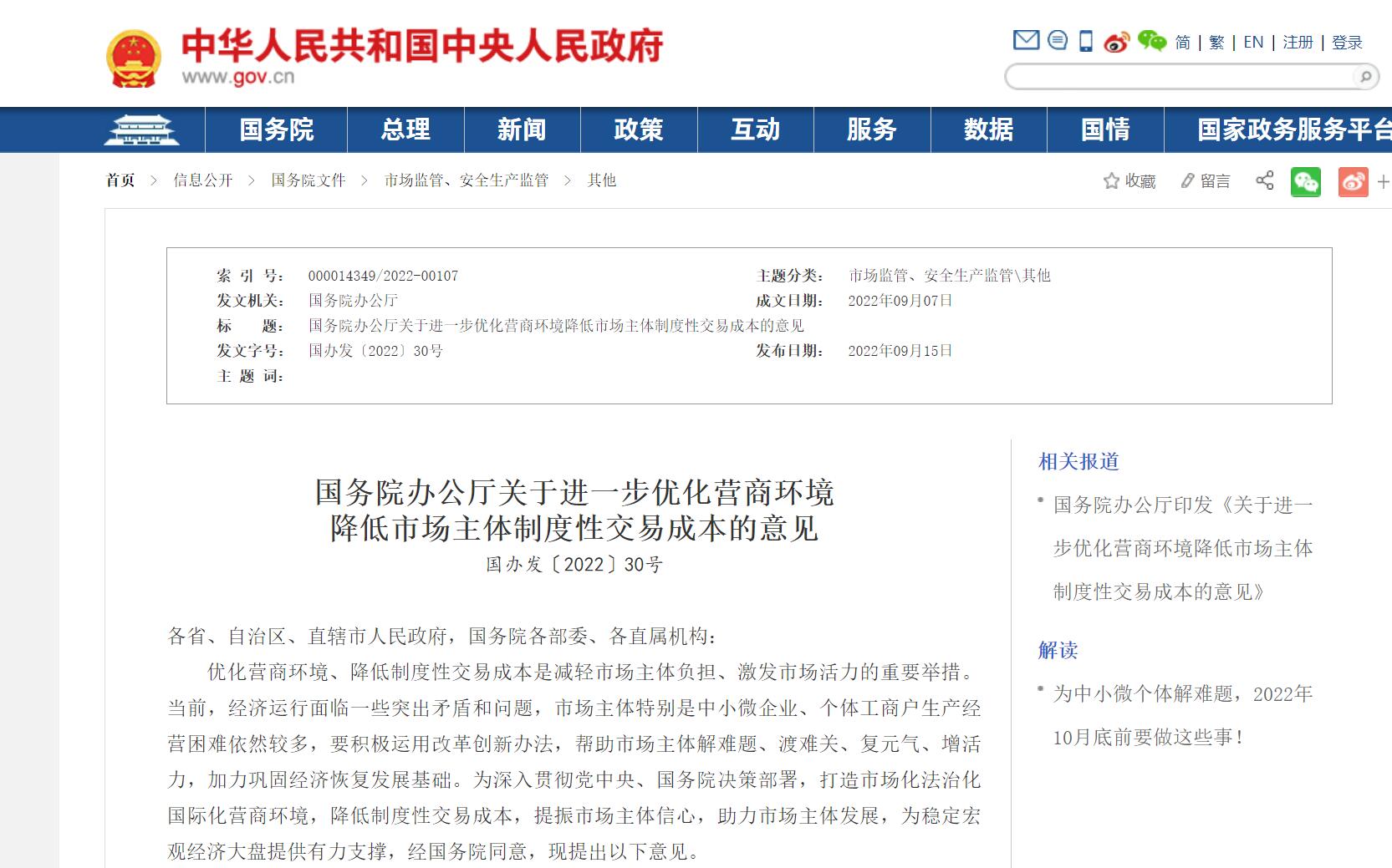 来源:中国政府网(版权归原作者所有,本文仅供交流学习,部分文章推时未能及时与原作者取得联系,若来源标注错误或侵犯到您的权益,烦请告知,我们将立即删除)封面图片来自网络国务院办公厅关于进一步优化营商环境降低市场主体制度性交易成本的意见国办发〔2022〕30号各省、自治区、直辖市人民政府,国务院各部委、各直属机构:优化营商......