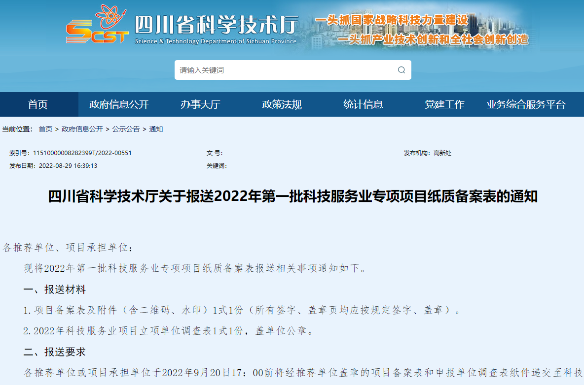 四川省科学技术厅关于报送2022年第一批科技服务业专项项目纸质备案表的通知