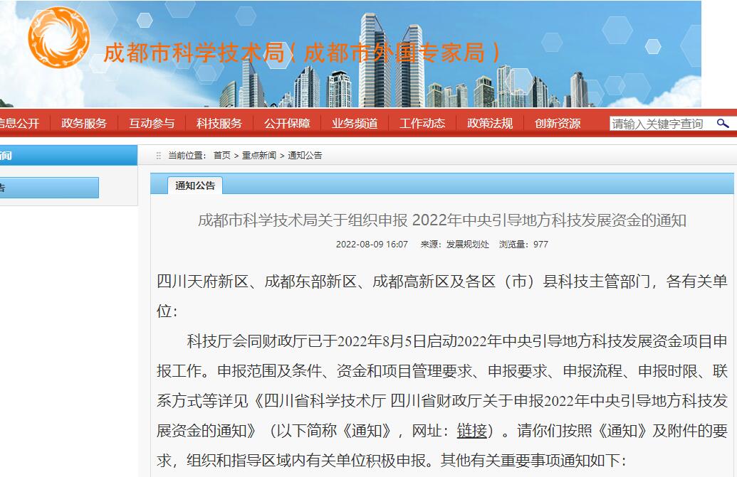 成都市科学技术局关于组织申报 2022年中央引导地方科技发展资金的通知