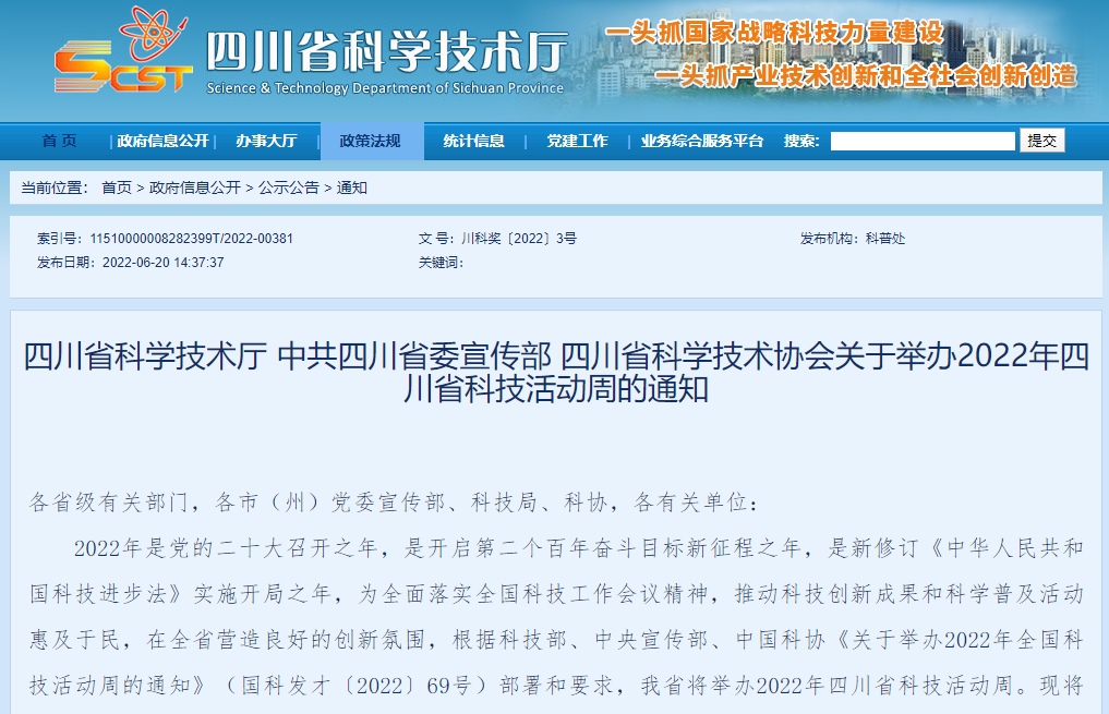 四川省科学技术厅 中共四川省委宣传部 四川省科学技术协会关于举办2022年四川省科技活动周的通知