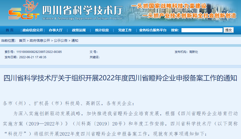 四川省科学技术厅关于组织开展2022年度四川省瞪羚企业申报备案工作的通知