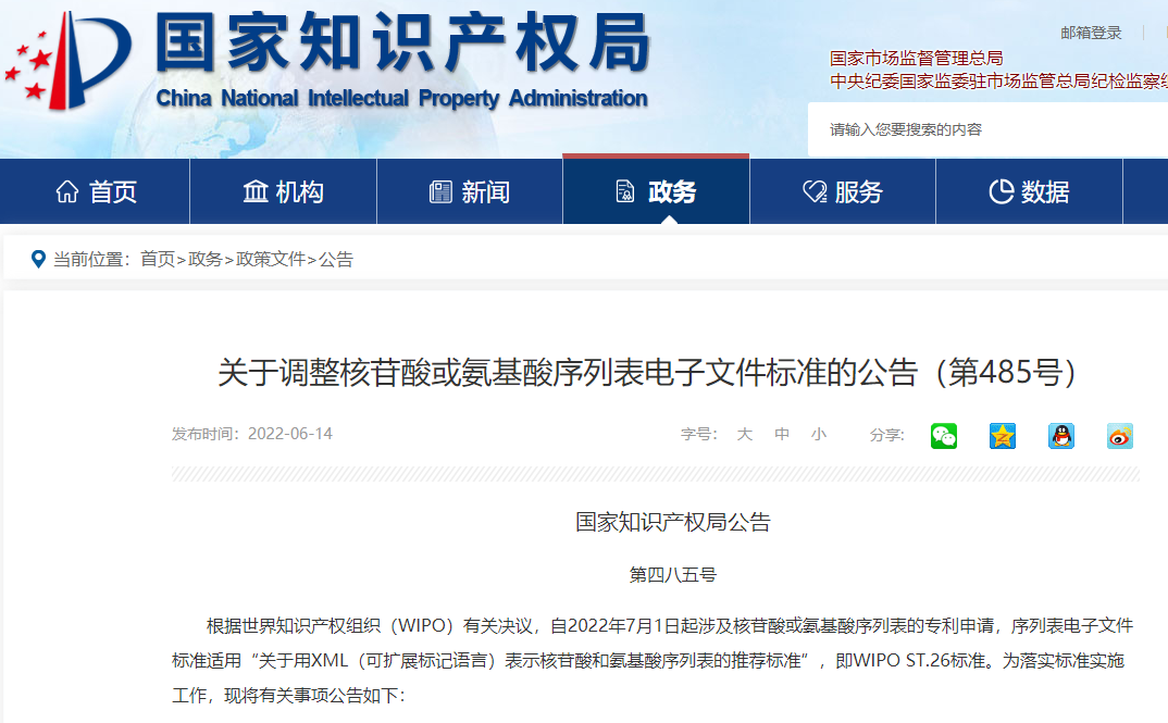 关于调整核苷酸或氨基酸序列表电子文件标准的公告(第485号)