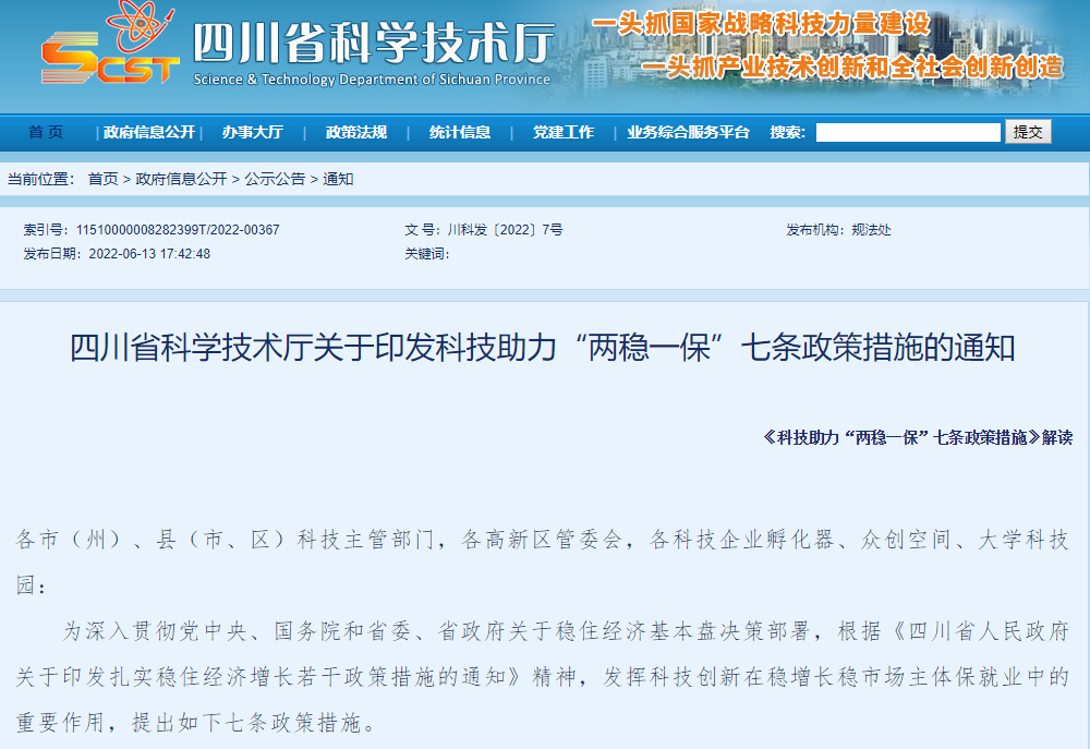 四川省科学技术厅关于印发科技助力“两稳一保”七条政策措施的通知