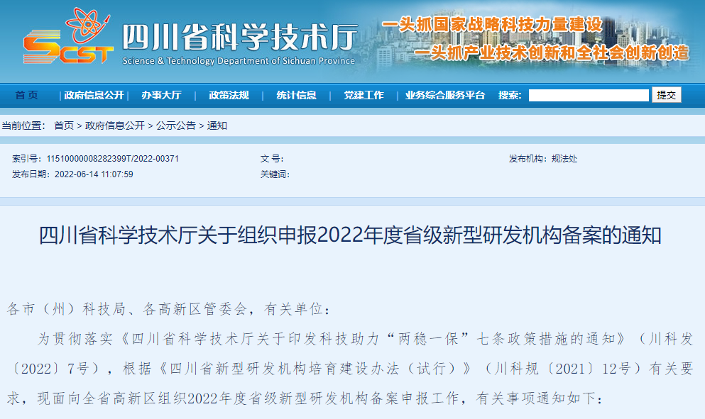 四川省科学技术厅关于组织申报2022年度省级新型研发机构备案的通知