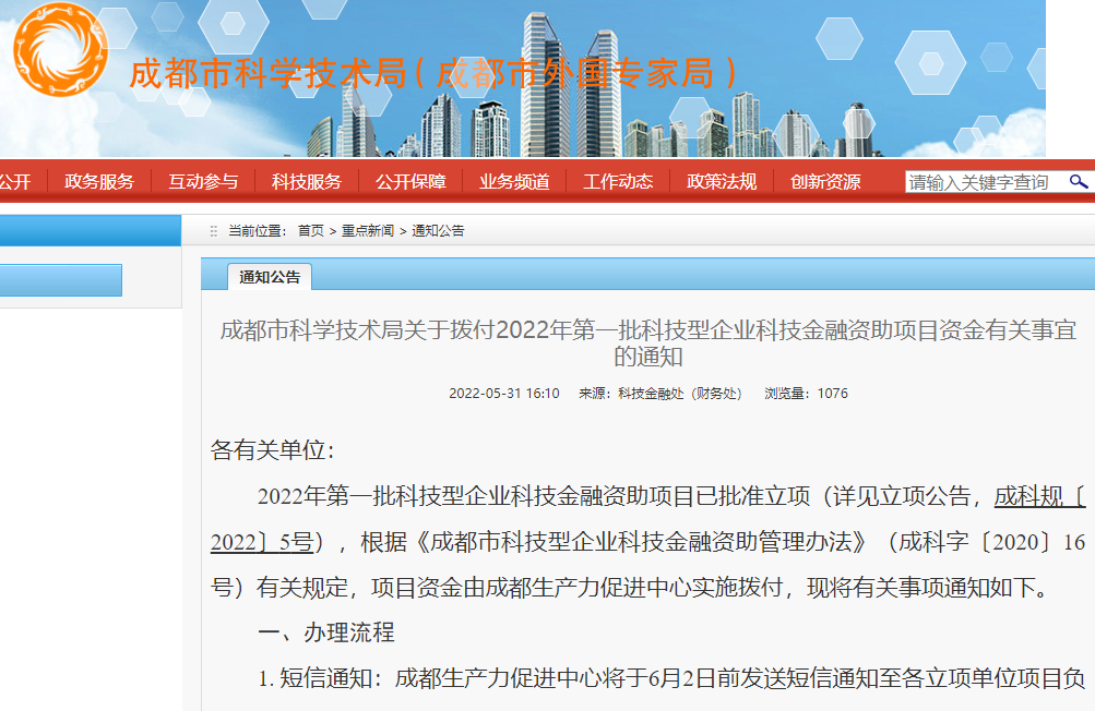 成都市科学技术局关于拨付2022年第一批科技型企业科技金融资助项目资金有关事宜的通知