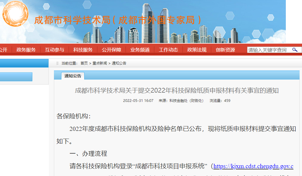 成都市科学技术局关于提交2022年科技保险纸质申报材料有关事宜的通知