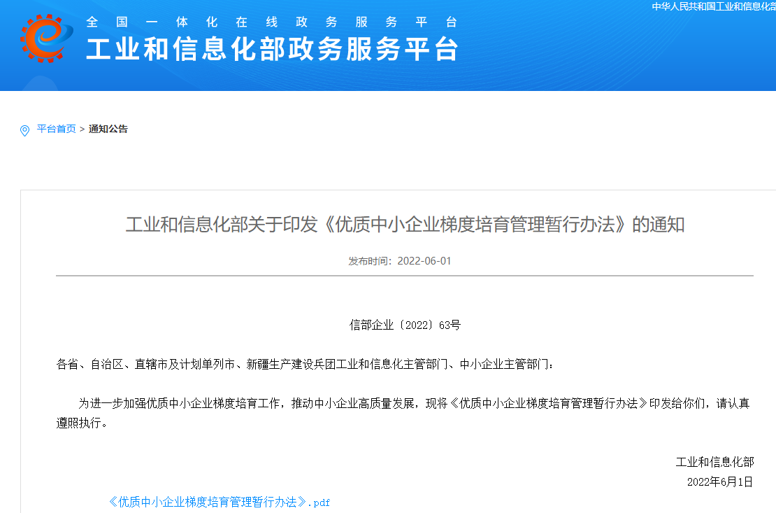 工业和信息化部关于印发《优质中小企业梯度培育管理暂行办法》的通知